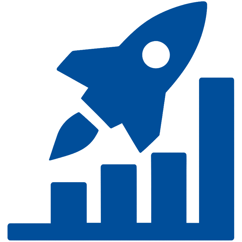 A blue bar chart with ascending bars, topped by a rocket icon, symbolizing growth or progress.