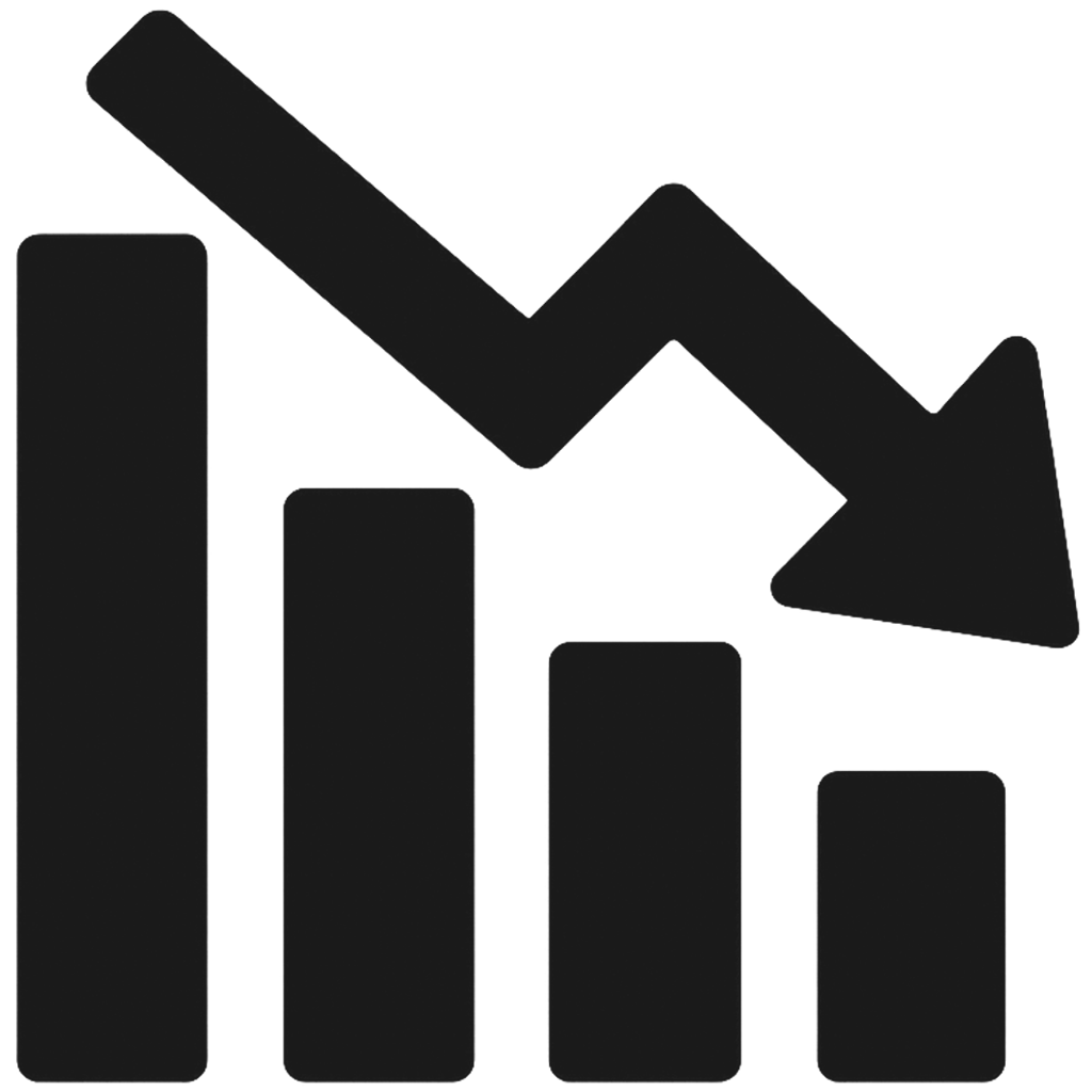 A black downward trending arrow over a bar chart indicating a decrease or decline.