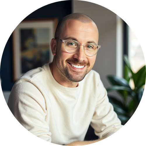 A smiling man with glasses and a bald head, wearing a white sweater, sitting indoors near a window with plants and artwork in the background.
